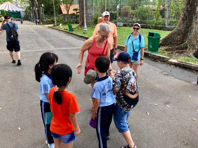 We first walked to the Museum of Vietnamese History which has exhibits from antiquity through most of the 20th Century. After spending an hour there, we wandered through the Saigon Zoo and Botanical Gardens where Dale’s favorite activity was teaching the kids there to “give me five.”