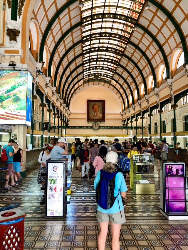 The Saigon Central Post Office, built in 1886-91, dates to the French Indochina colonial period. Here’s its interior with Vietnam’s “Uncle Ho” Chi Minh looking on. He is to present-day Vietnam what George Washington is to Americans.