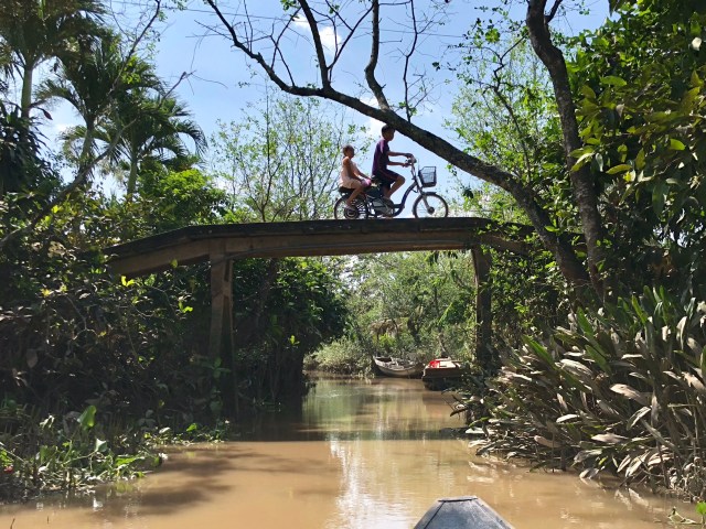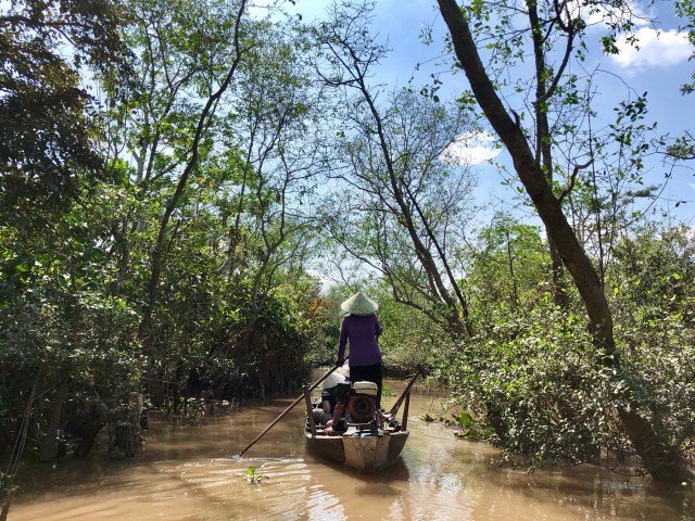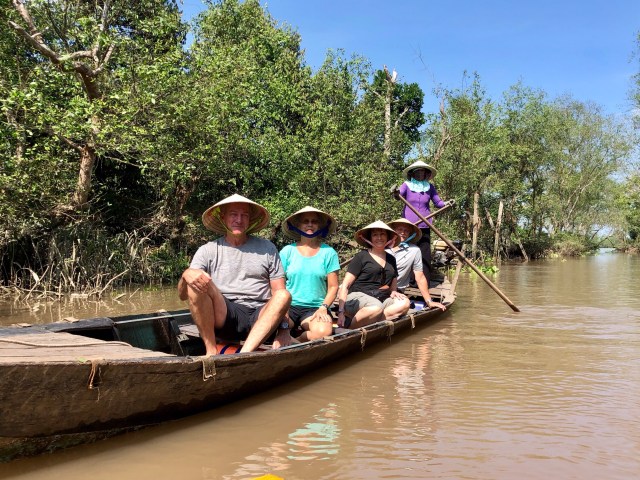 Along the way, Loc described described the river scene and informed us that we would be visiting an island to see rice paper made in the traditional way. To make us feel more at home in this traditional environment, Loc bought us each a nón lá, a conical leaf hat.