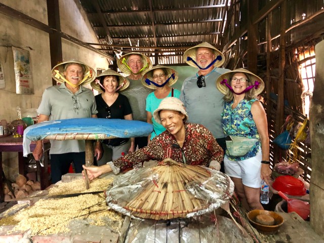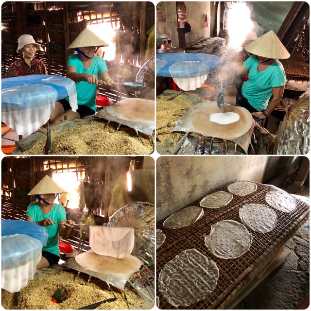 After a half-hour boat ride, we docked at the island and walked to visit Loc’s friend, Chị Ba, busily making rice paper in the bakery next to her house. The process is very similar to making crepes. First, water is mixed with rice flour to make a pancake batter, then poured onto and spread over a hot griddle and covered. Once cooked, the “pancake” is cut and lifted, then placed on a drying rack.