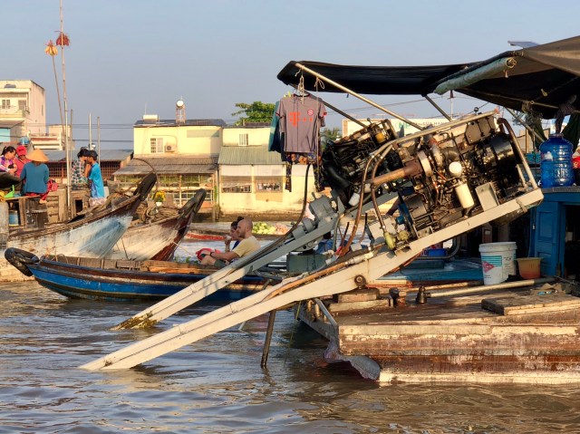Nearly all of these boats, large and small, have a unique engine mounting system. The larger boats have what look like water-cooled car engines with direct-drive shafts turning propellers about 20 behind, capable of being lifted in shallow water and swung around in order to be serviced at both ends.
