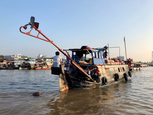 These vendors are middlemen, buying from farmers and selling to wholesalers. They advertise the produce they have available for sale by hanging examples from poles raised high above-deck.