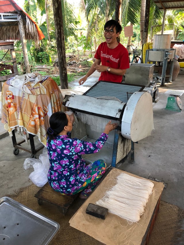 We made one last stop before returning to our embarkation point to see a rice noodle factory. The process for making rice noodles is the same as that used by Mrs. Three to make rice paper, but on a much bigger scale and with the addition of the machine that converts the rice paper into noodles, shown, below.