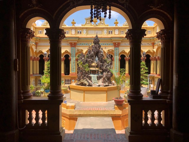 Although temples and pagodas are both houses of worship in Vietnam, temples are informal and we have been able to simple walk in and explore like at any other site of interest. Pagodas, on the other hand, are more formal and solemn; they are the residences of (in this case) Buddhist monks; shoes must be removed before entry and dress and decorum is more reserved. Here’s the inner courtyard of the Vinh Trang Pagoda.