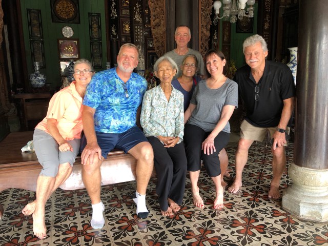 Back on land, we stopped at the Bihn Thuy Ancient House, a well preserved home from the French Colonial period, still in the same family ownership after six generations. Here we all are inside the house with its current resident.