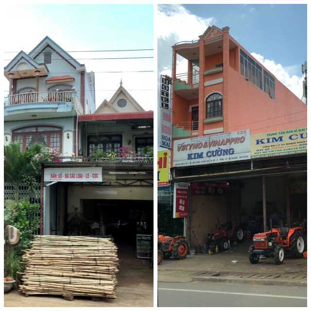 On the drive from Bao Loc to Da Lat, I took a few photos of houses along the road that were typical of southern and central Vietnam. Road frontage property is obviously at a premium and the lots are all narrow and deep, so most road front buildings are multi-story with the extended family residing in the back of the ground floor and on the upper two walk-up floors.