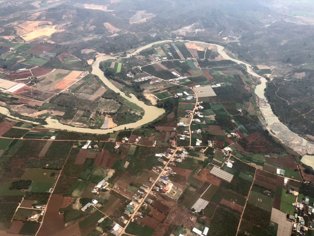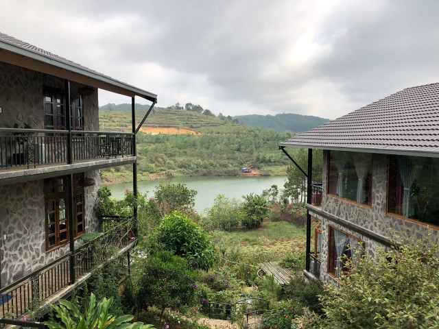 Da Lat is a popular tourist town, modern and energetic, but we were ready to avoid the hustle and bustle of the city, having spent several days now in Ho Chi Minh City. Anticipating our needs, Loc booked us outside the city at a beautiful place in the countryside owned by a German expat and his north Vietnamese wife, Zen Lakeside. Our stomachs still unsettled, I enjoyed having a western meal of schnitzel and potatoes. The owners picked some local medicinal herbs (read: leaves to chew up and swallow) for Dale which had her up and about in just a short time. Here’s the view from our rooms: