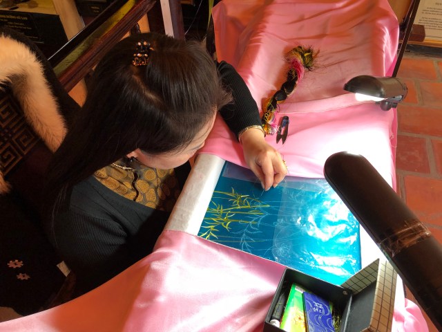 XQ is mainly known for its exquisite hand embroidery art work. It’s hard to describe just have beautiful and intricate these embroideries are. Each and every one is a masterpiece, some taking many months to complete. XQ Village Art Gallery seems to go on and on in labyrinth form. We were given a tour of the facility while the two embroideries we purchased were being wrapped for transport. Without a guide, we could have been lost in bowels of XQ Village for days. (Photographs of the artwork was not allowed inside XQ Village, but I was allowed to take this photo of a work in progress:)