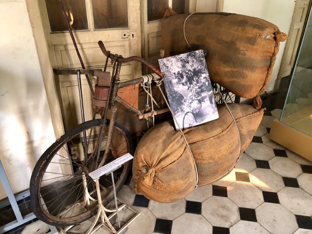 Throughout the late 1950s and 1960s, the Viet Minh moved troops and supplies south along Vietnam’s border with Laos and Cambodia on what came to be known as the Ho Chi Minh Trail. While we were in Saigon (now Ho Chi Minh City) we visited the City Museum where I took this photo of one of the many bicycles used by the Viet Minh on the Trail for this purpose: