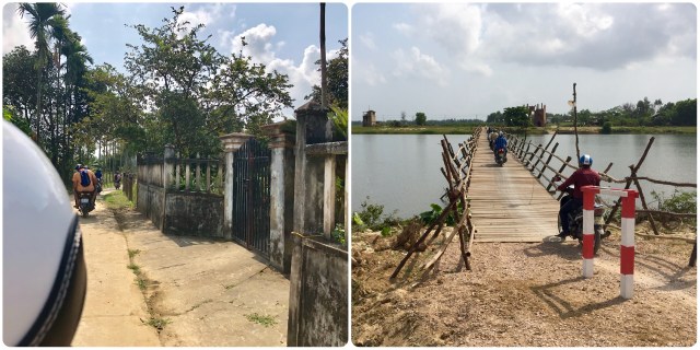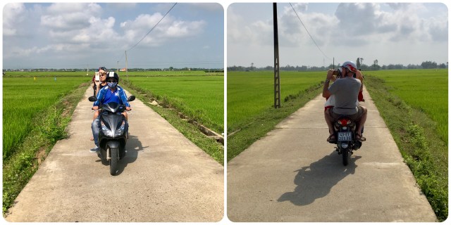 We quickly rode out of the city into the rice paddies. I was on the motorbike ahead of Dale and by pure coincidence we simultaneously took pictures of each other, so in the photo collage below, you can get the entire 360° view: