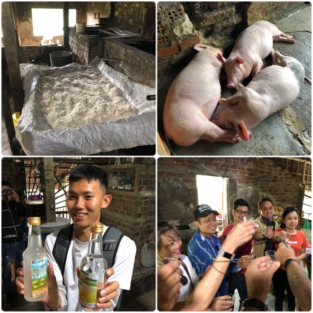 Next stop: rice wine distillery. The process wastes nothing. First, white rice is soaked and yeast is added. Next, the mash is stored in covered buckets to ferment. The fermented liquid is strained off and the remaining grain is fed to the pigs. While the liquid is then being distilled, the pigs sleep off their hangovers, waking periodically to “do their business.” The pig manure is stored below the distillery where it creates methane that is burned to heat the still. The alcohol that is created in the distilling process is collected and bottled, and, presto! Rice Wine! Yo!