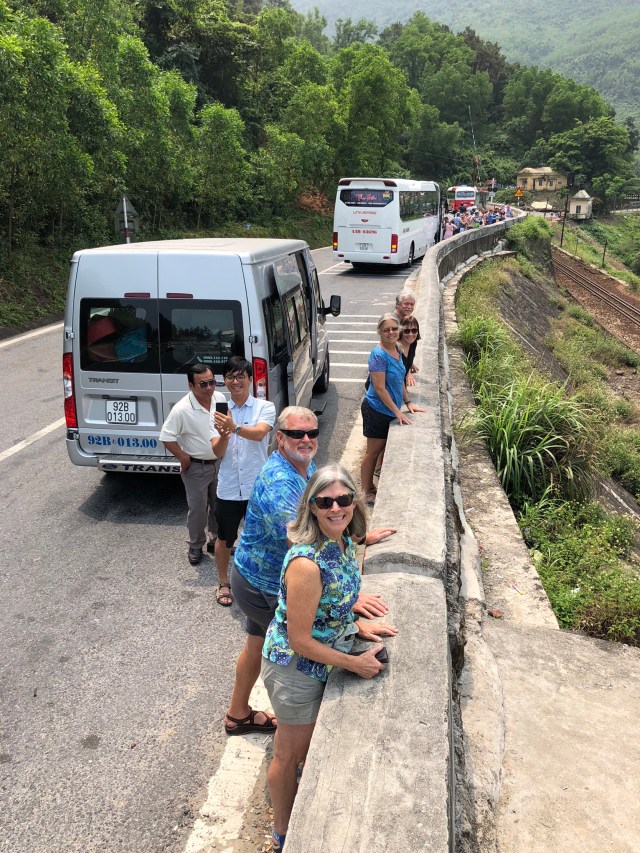 On Monday, we drove north from Hoi An to the city of Huế (pronounced: “Whey”). About fifteen miles north of Da Nang, we stopped at the Hai Van Pass where defensive embattlements have been built in turn over the years by the Chinese, French and Americans during their military excursions here. Here’s the view looking north toward Huế:
