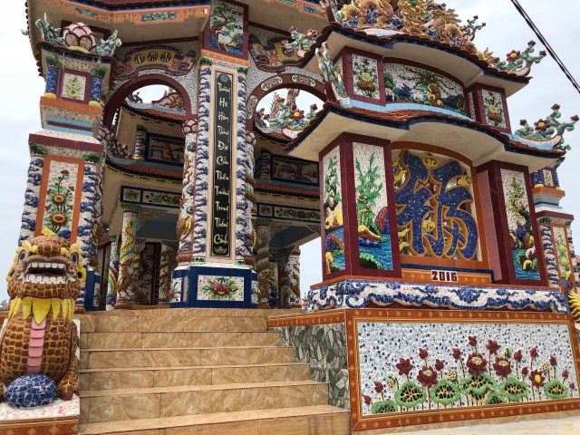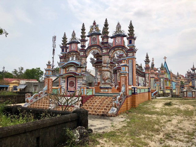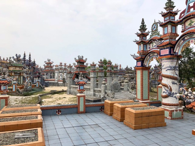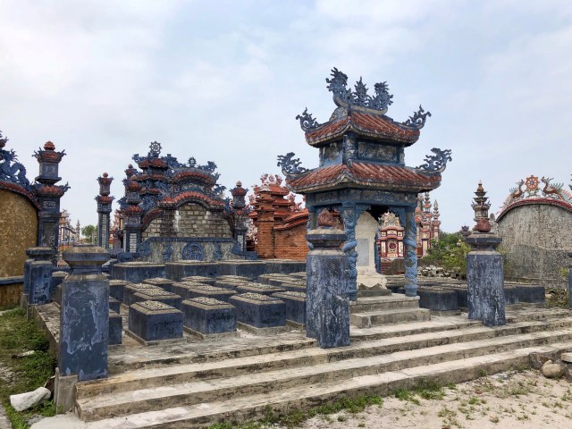 We continued north to the Vinh township barrier island, passing through several small fishing communities on the way. Interspersed among the houses and fields we saw many tombs along the road. We were surprised by the size of some of these family monuments and graves, but Loc assured us that these were small tombs and he was taking us to an off-the-beaten-path site he had discovered and named “The Craziest Graveyard in the World!”