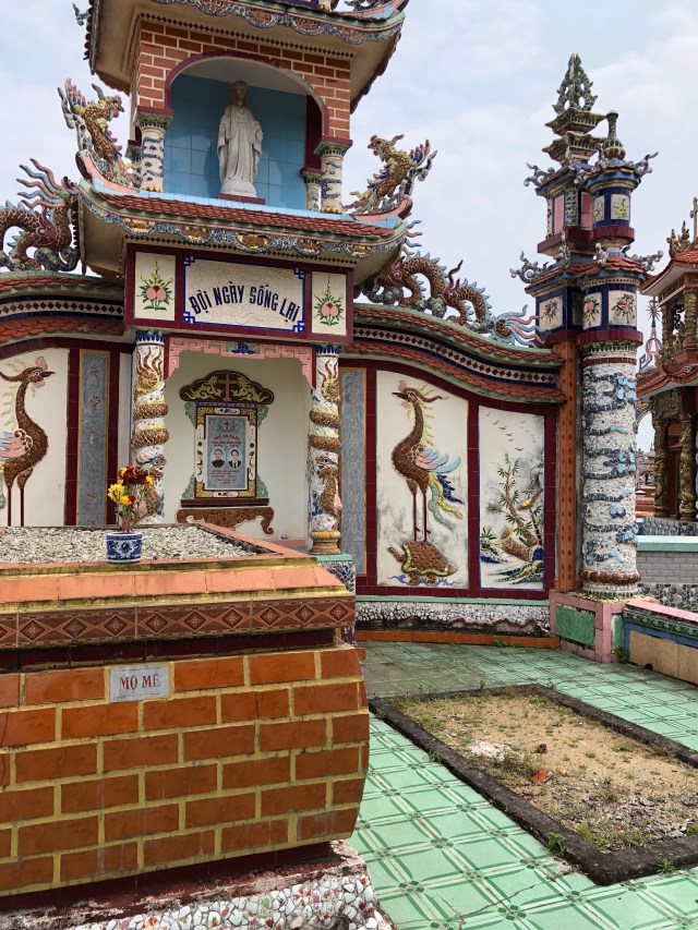 As you can see in the photos above, there are numerous individual graves in each family tomb. We were surprised to see that a number of the tombs were Catholic, obvious from the Mary and Christ statues, like the one below, still awaiting the family patriarch (the grave on the left is labeled Mộ Mẹ, “Mother’s Grave”).