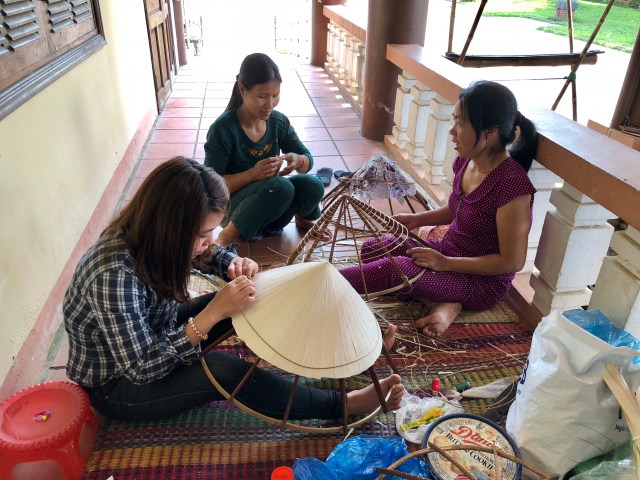 After the ceremony, we continued to the local museum – which had terrific exhibits with good explanatory placards in english. At the museum’s entrance were three young women making conical hats. I had no idea that there was so much work involved in creating these things which many people here – especially in the countryside – actually do wear on a daily basis.