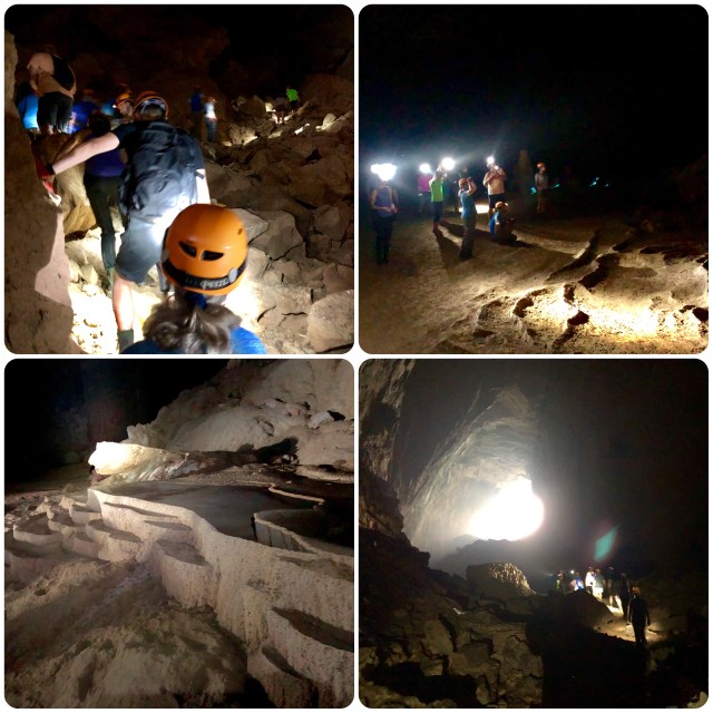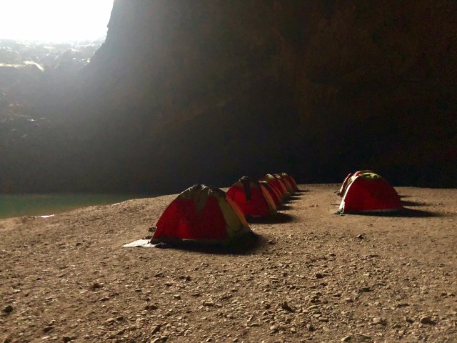 We donned helmets and headlamps, then descended into the cave through the lower entrance, stopping on a ledge to get our first view of the prepared campsite that had already been set up by Oxalis porters and staff.
