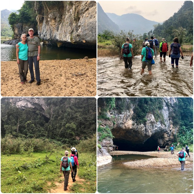 After lunch, we continued our descent, ultimately reaching the river at the bottom of the valley. The river floods annually, submerging everything. We had about 20 river or stream crossings over the next 2.5 hours of hiking, ultimately reaching the lower entrance to Hang En Cave around 4:00 in the afternoon. The lower left photo, below, is our first glimpse of the inaccessible upper entrance to the cave; the photo on the right is the actual entrance: