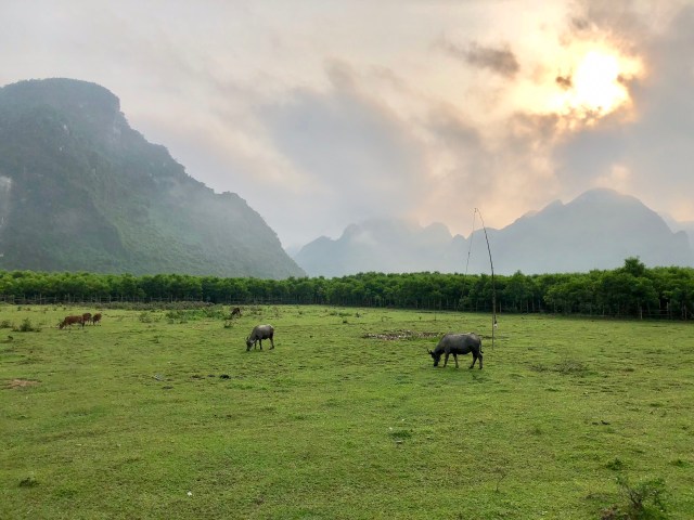 Here’s the scene right in front of our Chay Lap Farmstay; that fishing pole rig is tied through the water buffalo’s nose to keep him within a small grazing circle.