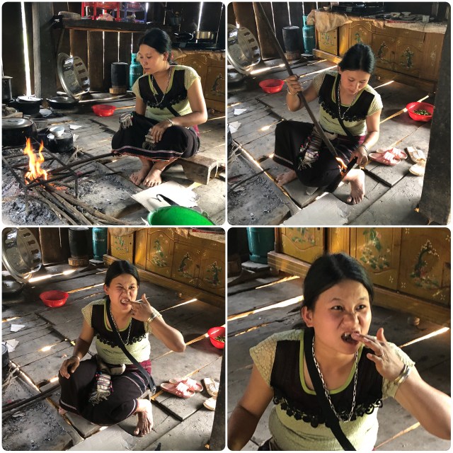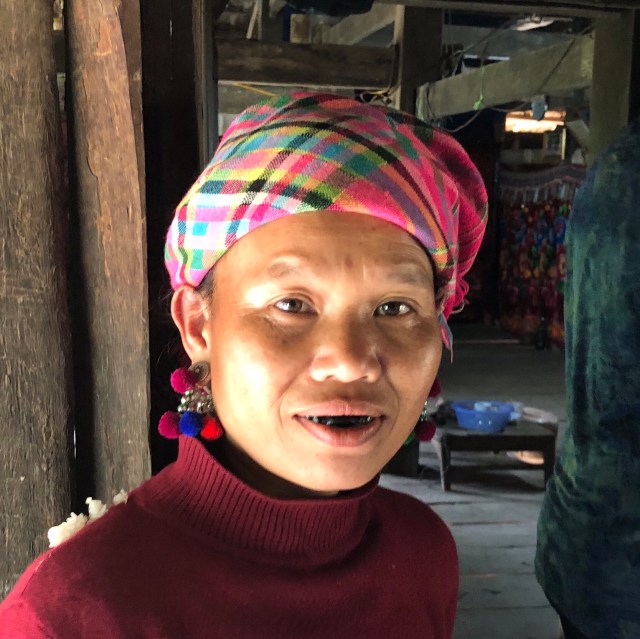 It seems that the custom is dying out. Most of the younger women we met in the village now have a few gold-capped teeth instead of having them blackened. Here’s a closer look at one of the younger women we saw that still blacken: