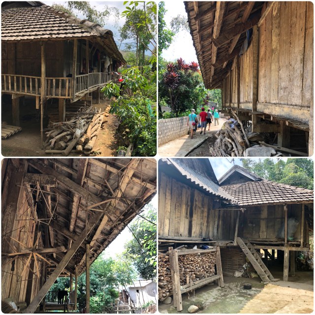 Most are traditional stilt houses like these. In the bottom, left photo, hanging from the rafters, are spindles for spinning thread. We saw these and a reconstructed Lao stilt house at the Museum of Ethnography in Hanoi the other day and here they are, still in use in this community!