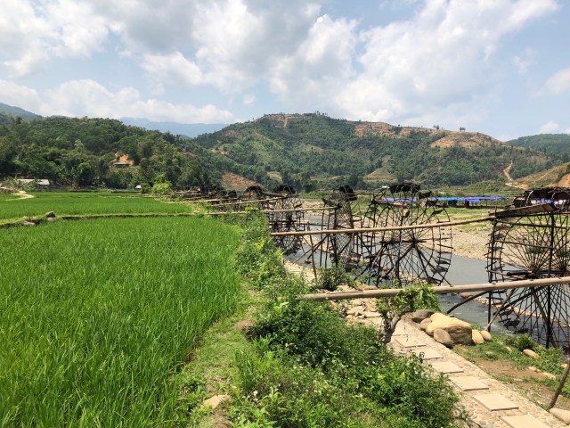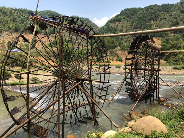 After leaving Na Luong village, we drove a few miles downstream to see what Loc called a “water wheel,” a rarity these days. It turned out to be an ingenious irrigation system made of bamboo.