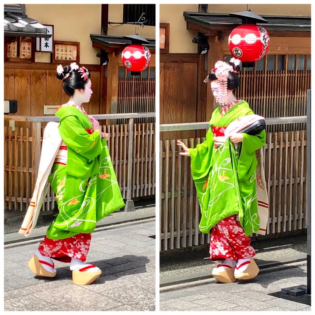 As we were walking down Hanamikoji-dori, “flower viewing lane,” a crowd was milling about in front of a closed-door establishment. We stopped and waited. After a few minutes, the door slid open and out walked a real geisha! We were lucky to see this. It’s unusual to spot geisha during the day, even in the Hanamachi.