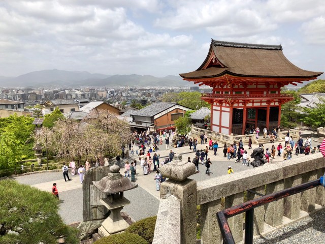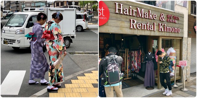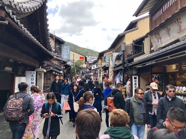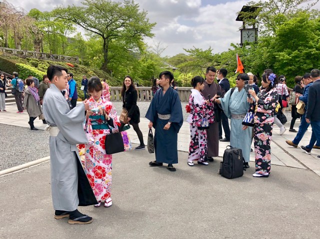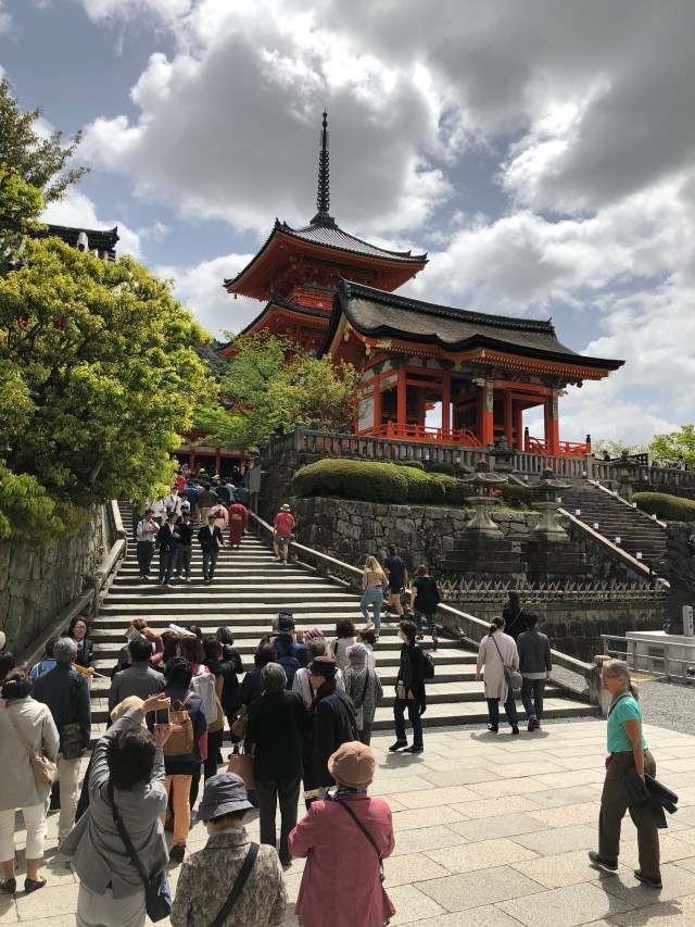 Leaving the Sanjusangendo Temple, we walked further north to the Kiyomizu-dera, another Buddhist temple devoted to the goddess Kannon. Along the way, we passed a number of women in traditional kimono, apparently rented from one of the several shops along the route to Kiyomizu-dera for a “pilgrimage” to the temple.