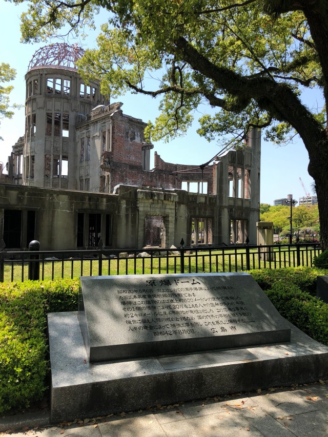 In Hiroshima city, we had a singular purpose: to visit the Hiroshima Peace Memorial Park, the infamous location of the first use of a nuclear bomb. The centerpiece of the Memorial Park is the Genbaku Dōmu, the “A-bomb Dome.” In 1967, the city of Hiroshima erected a monument in front of the A-bomb Dome. The plaque on the monument explains that: