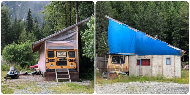 We noticed a common theme during our drive around Hyder: many of the “buildings” have double roofs, that is, pole barns erected over the roof of the main living quarters, like you see above with the post office. I suppose this is done to support the heavy snowfall they get here. The two residences in the photo, below, are actually on opposite sides of the street, but I think they would be more functional and pleasing to the eye if they were next to each other like I have photoshopped them: