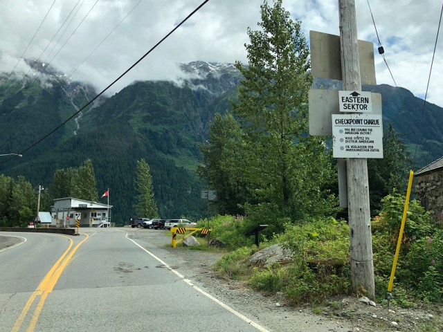 There is no border control going from Canada (Stewart) into Alaska (Hyder), but there is one going the other way, as you can see in the photo, below. Judging from the signs on the American side, I’m guessing there’s a lingering resentment over the 1903 Alaska-Canada border settlement.