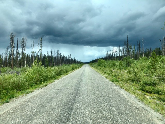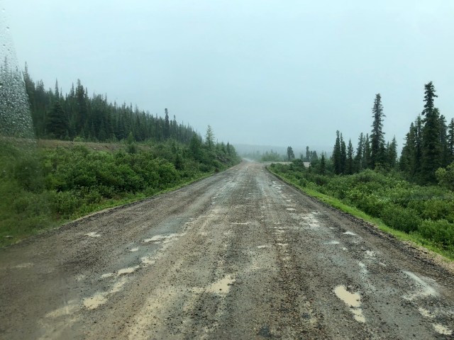 About an hour north of Iskut, before reaching Dease Lake, a resurfacing project left the road riddled with potholes in the rain for several miles, making for a rough and dirty ride. Over the course of the drive so far, we have acquired two windshield chips and a broken driver’s side running light, all from rocks thrown up by passing vehicles near these construction projects.