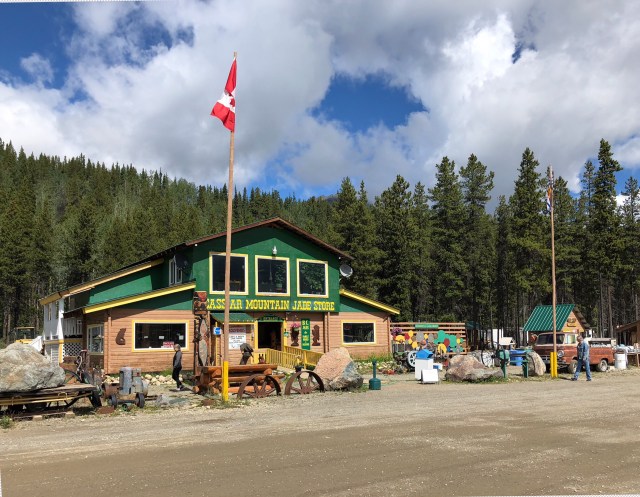 Further on up the road we came to one of the few buildings on the Cassiar Highway, the “World Famous Jade City,” according to the signs, anyway. We stopped for a free coffee and a browse around. We were about to buy a jade inuksuk and some jade jewelry when I thought to ask, “Are these made here?” Answer: “No, they’re made in Cambodia. We could make them here, but it’s cheaper to get them from Asia.” The story of the modern world. We passed on the purchase, but being a rockhound, I did buy a nice 5 pound block of local cut jade that I intend to polish up and use as a bookend.