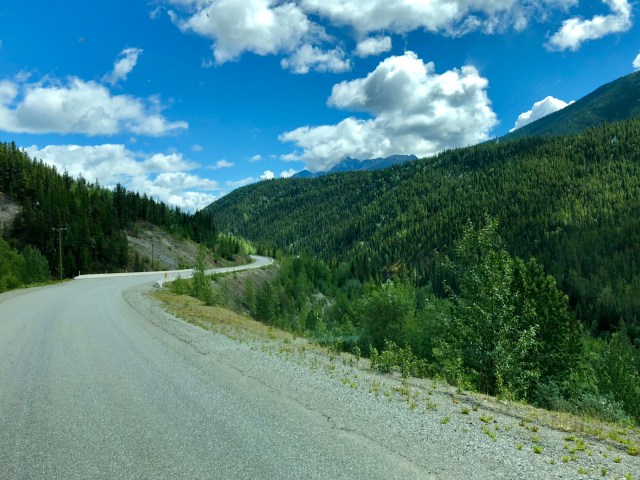 Just a few miles further up the road, at about the halfway point of the length of the Cassiar Highway in British Columbia, the road changed: no more pavement markings, lanes a little narrower and the road surface a little rougher. The rain didn’t improve the driving conditions either, other than to keep the dust down.