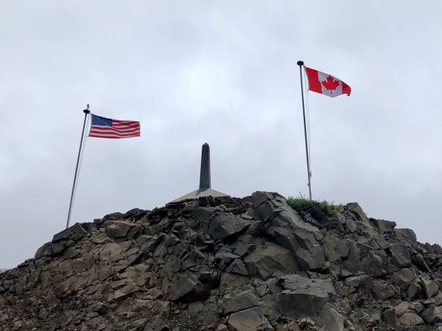 Back in Gold Rush days, the Canadian government had set up a Royal Mounted Police post at Summit Lake to monitor the stampeders. It is still more or less intact, though unoccupied, but I turned my camera toward this scene at the summit, instead: the international boundary post and the countries’ flags.