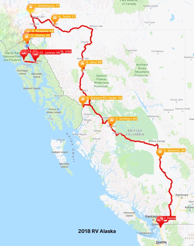Here’s a map of our travels so far, including our upcoming flight to Gustavus and Glacier Bay via Juneau.