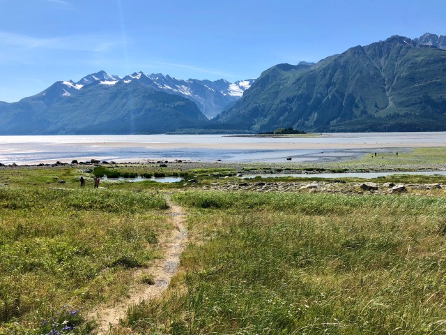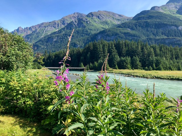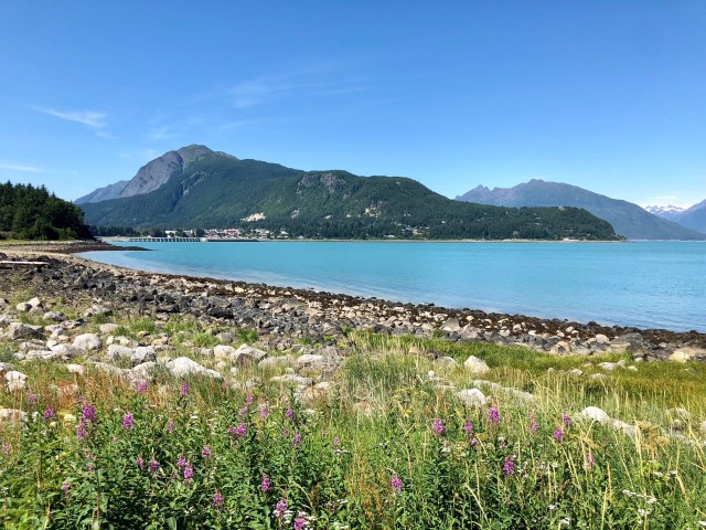 After our paddle, we drove back to Haines, following the Chilkoot River to where it flows into the Lutak Inlet. That’s Cow Parsnip in the foreground (white flowers); it’s edible and supposedly tastes like celery.