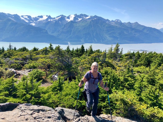 There was a young woman from Fairbanks at the summit when we arrived. She had hiked up in plastic slippers and said she had driven 13 hours from Fairbanks to visit Haines because Alaskans think it’s the prettiest part of the state. We chatted for a while and she offered to take our photograph, “just $50,” she joked. That’s Haines in the background, surrounded on all sides by water and snow-capped mountains.