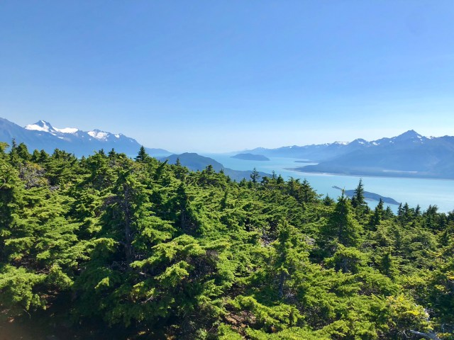 We were told that there are only two types of conifers in this part of Alaska: Sitka Spruce and Western Hemlock. They have a similar appearance, but their needles have a different texture. Here’s a view looking south from the summit over those trees and down the Lynn Canal.