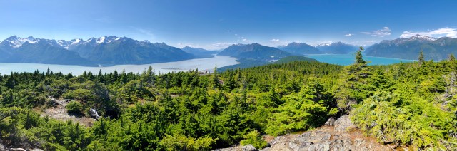 Looking north from the summit we could see how the Chilkoot Peninsula splits the Lynn Canal into the Chilkat (left) and Chilkoot (right) Inlets. Notice the difference in the water color. The Chilkat is glacial meltwater, filled with silt, giving it a cloudy appearance. The Chilkoot is saltwater at this point, being further downstream from its glacial source, so it’s blue and clearer.