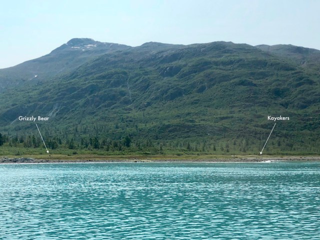 We continued south past Reid Inlet, then stopped to peer through our binoculars at the shore where a group of kayakers had set up camp. To the left – and apparently unbeknownst to them – was a Grizzly Bear, feeding in a nearby berry patch!