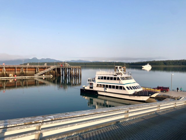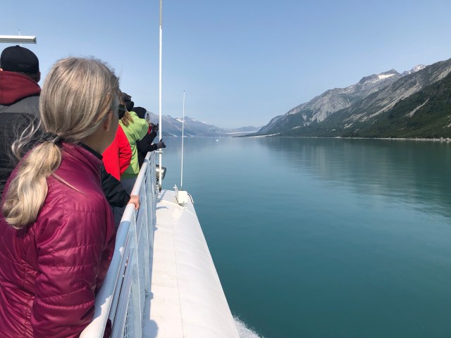 Our 3-night reservation at Glacier Bay Lodge included an all-day, 150-mile boat ride from the dock at Bartlett Cove, north to the far end of Glacier Bay. We walked down to the dock early Monday morning, arriving about 6:30 a.m., the sun had already been up for 2 hours. This time of year at such high latitude the days are 17 hours long with the sun rising around 4:30 a.m. and setting at 9:30 p.m. But accounting for twilight, true darkness lasts for only 3 hours, 11:30 p.m. to 2:30 a.m.