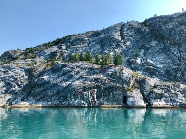 We watched our mountain goat for about 15 minutes as he edged along the rocks foraging. How these animals are able to so easily range this terrain is beyond my comprehension. We edged along to the north, continuing to look, spotting only one more goat and a nearby eagle. The Park Ranger on board said that eagles will attack younger mountain goats in an effort to dislodge them from the cliff face, in order to feed on the carrion.