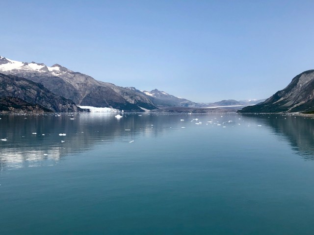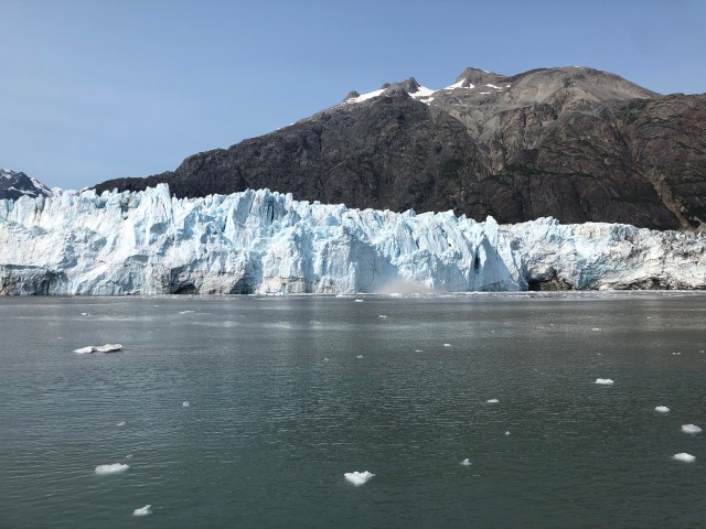Take a good look at the photo, below. To the left is Margerie Glacier and just to its right, focus on the white spot – that’s a cruise ship!
