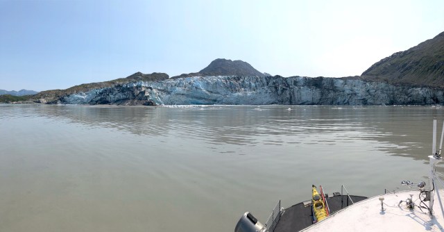 After spending about half an hour admiring Margerie Glacier, we then began our journey south back to Bartlett Cove, first detouring up John Hopkins Inlet to its glacier, then retracing our steps to stop in front of Lamplugh Glacier, the calving of which drops growlers and bergs into the shallow sediment before it, stirring up silt and giving the water a muddy appearance. [Note the kayak carried on our bow; more on that in a moment.]