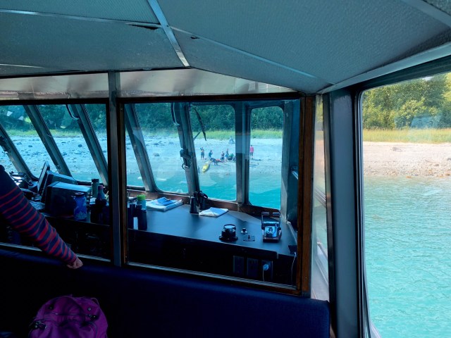 Seated in front of us in the boat was the young couple whose kayak sat on our bow. They made a verbal note to avoid this campground. Twenty minutes later, just past Gilbert Peninsula, the bow of our boat bumped against shore near Hugh Miller Inlet to drop these folks and others off for an overnight adventure.