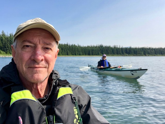 Dale paddled close to shore, in search of orange starfish. The shoreline looked like this all the way to the point on Glacier Bay ahead of us.