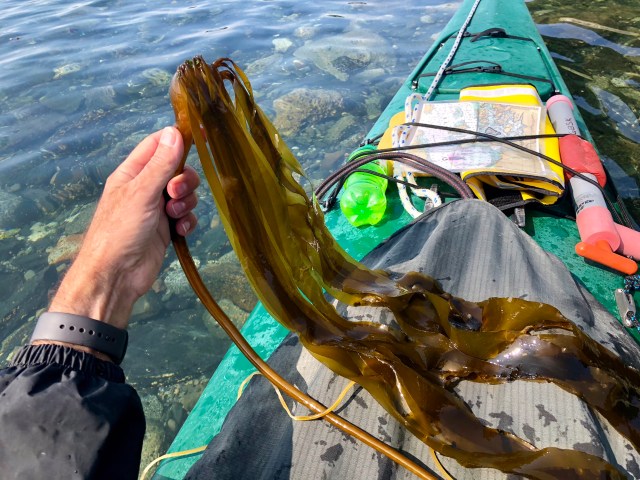 I stopped briefly to scoop some kelp out of the crystal clear water.