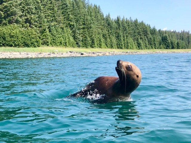 As we retraced our route, we saw a single sea lion down the shoreline. We put down our paddles and awaited his approach. Suddenly, his head popped out of the water right at the bow of my kayak, so close that I could count the whiskers on this salty dog!