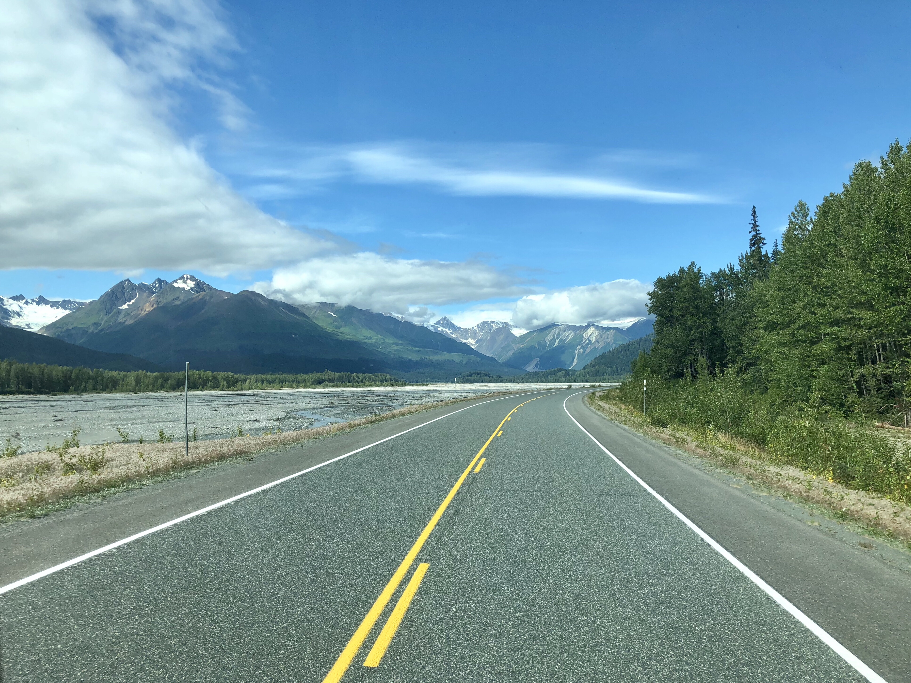 Arriving back at the RV around 7:00 p.m., we had time to do laundry for the first time on the trip. Early to bed, early to rise, we unhooked Thursday morning, pressure-cleaned the RV and Jeep at the self-service carwash across the street from the campground, topped off the fuel tank at the nearby gas station, then off we went, driving north on the Haines Highway (AK7) parallel to the Chilkat River.