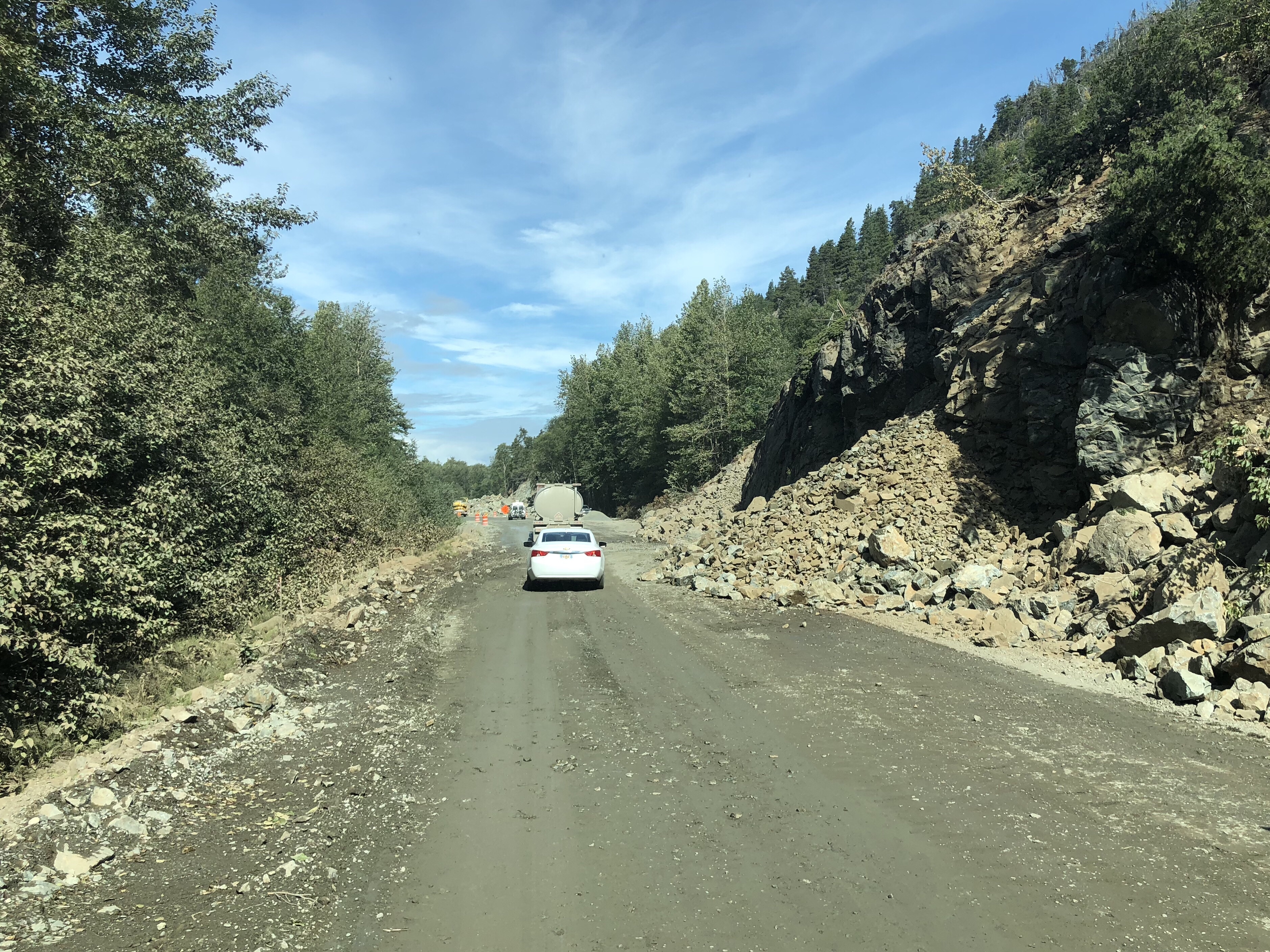About 10 miles out of Haines, we came upon a several mile long construction project, shoring up and stabilizing the river bank and also apparently cleaning up an earlier landslide: